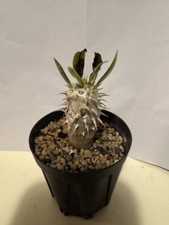 とげとげしいですが可愛いこの植物は「パキポディウム」というマダガスカル原産の多肉植物でグラキリスという人気のある種らしいです。
