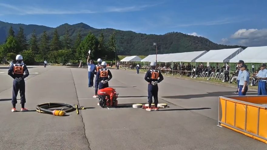 時を遡ること昨年の5月、喬木村消防団では小型ポンプ操法の練習がスタートしました。小型ポンプ操法とは1チーム4人で持ち運び可能な可搬ポンプを使い消火活動に必要な一連の操作の正確さや綺麗さ、火点と評した的を水で射抜くまでの速さを競う競技です。消防団員は普段はそれぞれに仕事をしているので練習は平日の夜。私達のチームは週に3~5日程の練習をしました。もちろん仕事で体はへろへろ、そして家族もいる。自分も辛かったけど色んな人にも迷惑をかけている、そんな中で正直練習に行くのも嫌な時もありました。しかし私達のチームは全員野球経験者ということもあり、やるからには勝ちたいという気持ちの方が強くあり練習には必ず全員が集まりました。
