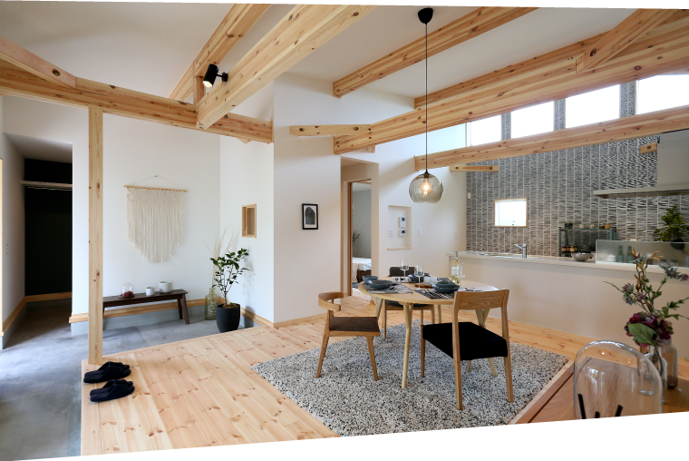 生活のすべてをワンフロアに集約した平屋。家の中心にあるリビング&ダイニングは自然と家族が集まります。