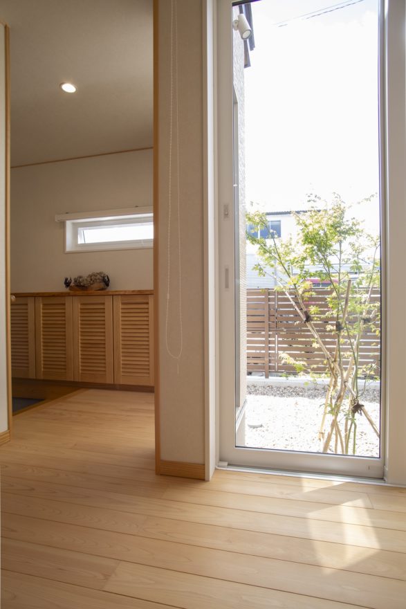 カウンタータイプ下足箱と縦長のピクチャーウィンドウが、空間を明るく広やかに見せてくれます。