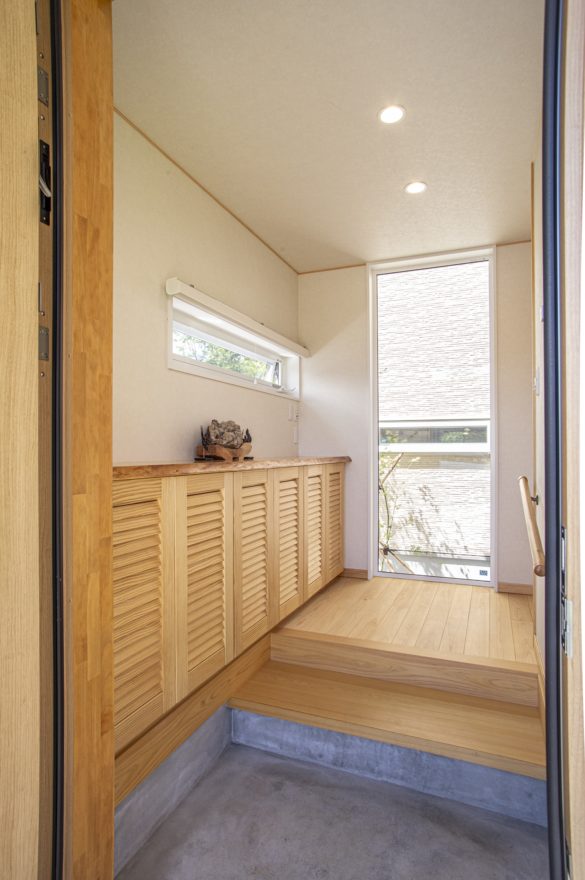 カウンタータイプ下足箱と縦長のピクチャーウィンドウが、空間を明るく広やかに見せてくれます。